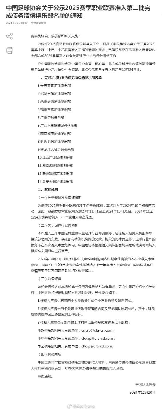 中國足協(xié)公示2025賽季職業(yè)聯(lián)賽準(zhǔn)入第二批完成債務(wù)清償俱樂部名單,此前不在第一批名單里的長春亞泰、武漢三鎮(zhèn)、滄州雄獅、梅州客家、廣州、廣西平果哈嘹、南京城市、延邊龍鼎、黑龍江冰城、江西廬山、湖南湘濤、贛州瑞獅、泰安天貺全員上榜,相當(dāng)于所有三級職業(yè)俱樂部都進(jìn)行了完成債務(wù)清償?shù)墓尽????