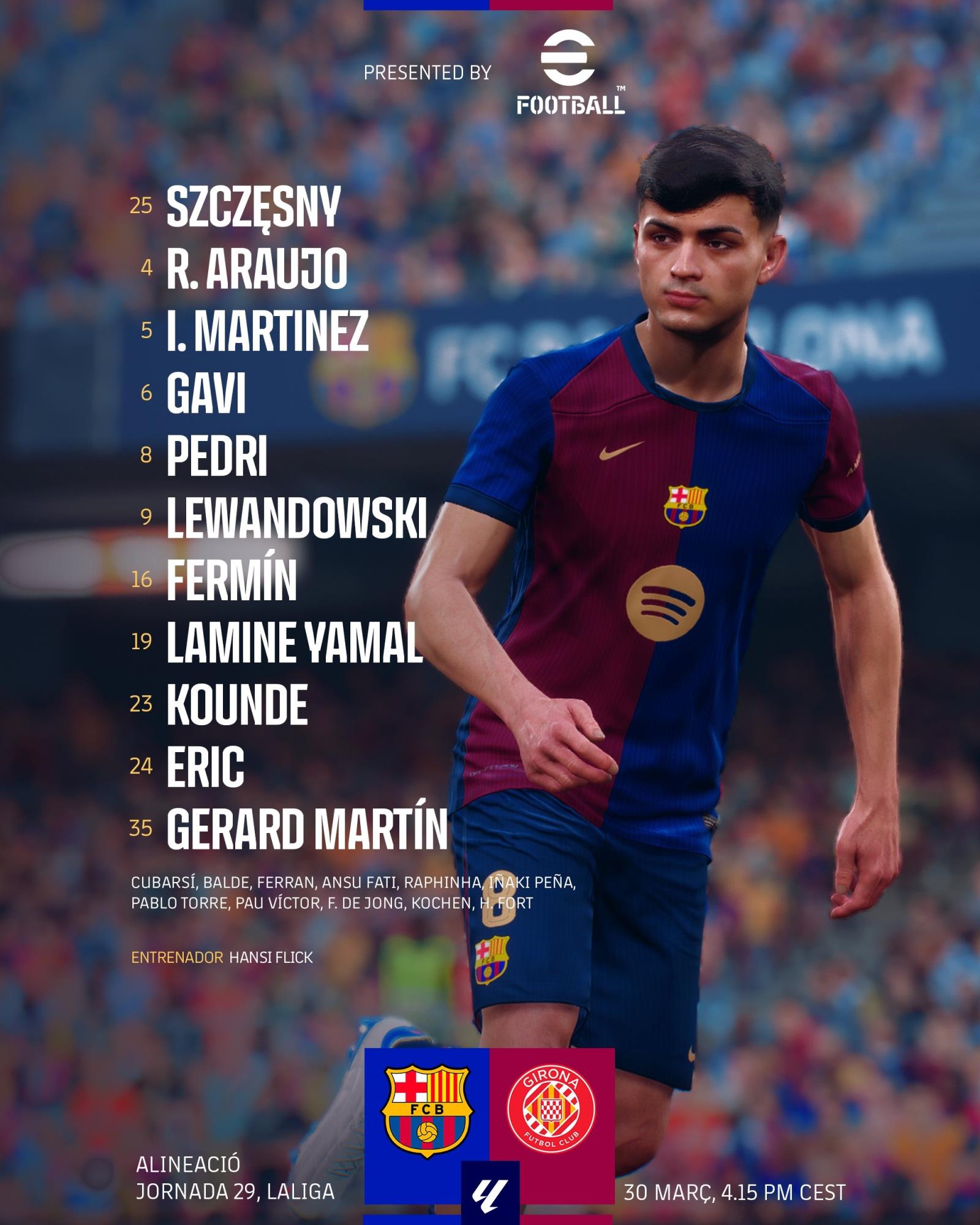 巴薩首發:25-什琴斯尼、4-阿勞霍、5-伊尼戈-馬丁內斯、23-孔德、24-埃里克-加西亞、35-杰拉德-馬丁、6-加維、8-佩德里、16-費爾明、19-亞馬爾、9-萊萬